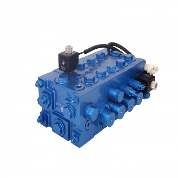 该系列多路阀提供一种合流起升负载敏感多路阀,该阀匹配双泵结构,通过内部反馈油道控制卸荷单向阀来控制其中一个泵的工作和卸荷,当需要起升动作时,反馈油关闭卸荷单向阀,双泵合流去起升;当需要倾斜或属具工作时,反馈油打开卸荷单向阀,其中一个泵卸荷,这样能有效的提高效率,降低整车温度。另外该阀采用负载敏感设计,能实现输出流量与阀杆的行程变化的匹配,操控性能大大提高。